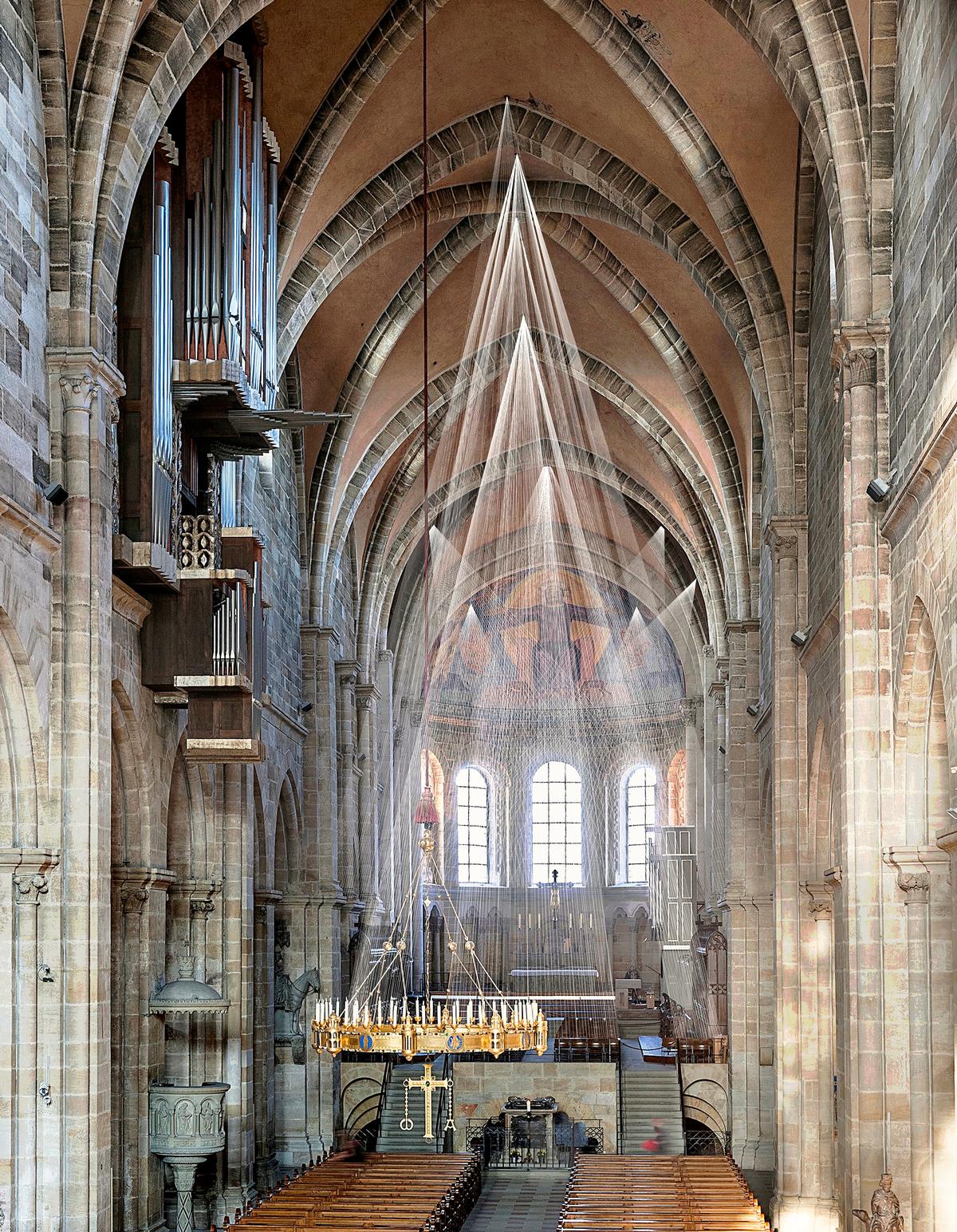 Tausende feinster Fäden werden die Besucherinnen und Besucher im 1000. Todesjahr Kaiser Heinrichs II. im Bamberger Dom entdecken: Die kunstvolle Fadeninstallation von Elke Maier spannt sich im Ostchor und über dem Kaisergrab vom Gewölbe hinab, reflektiert und bündelt das Licht. Dabei bieten sich je nach Tageszeit oder eigenem Standort immer wieder neue Perspektiven: Ein stetes Erscheinen, Aufscheinen und Verschwinden der Fäden.