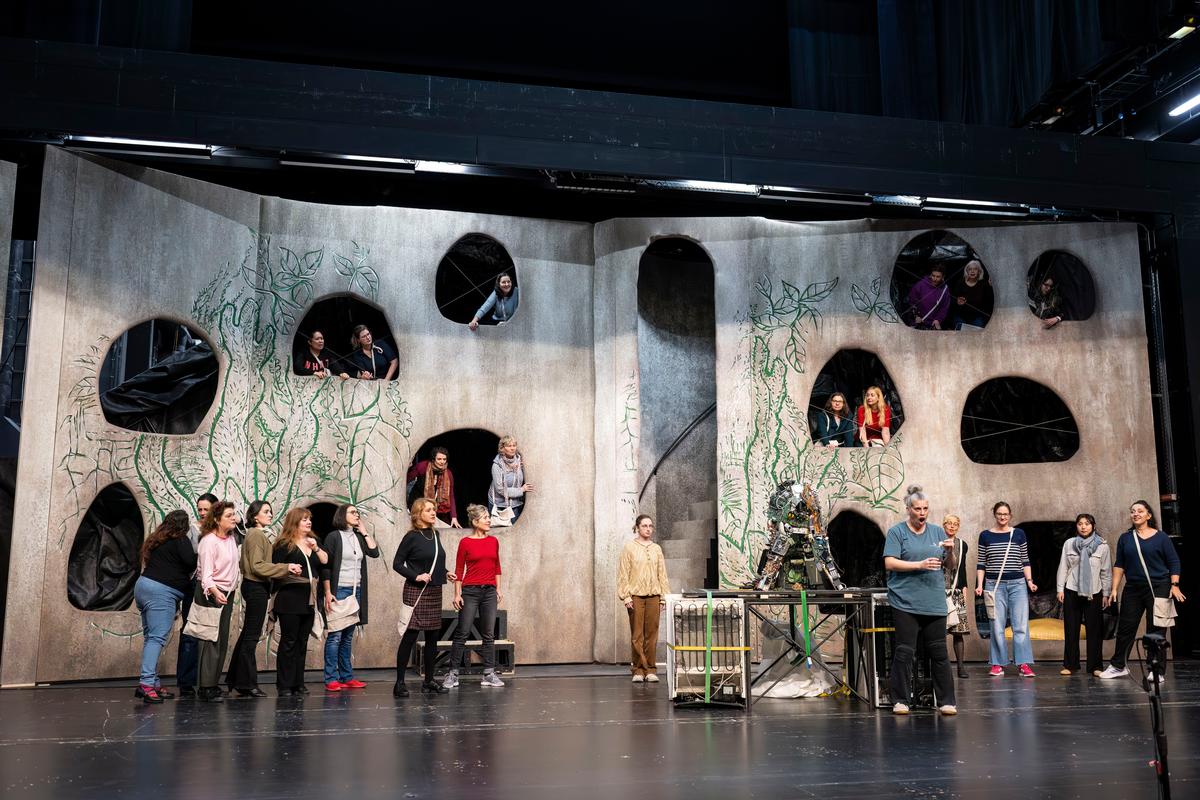 Für die Inszenierung wählt Kastening einen dystopisch düsteren Raum in der Zukunft, aber dennoch nur wenige Schritte vom Heute entfernt. „Es ging darum“, sagt sie, „einen Rahmen zu finden, der das Verhalten dieser Figuren erklärt.“ Die Erde ist verkommen, für die Menschen nicht mehr bewohnbar. „Die Gesellschaft“, so die Regisseurin, „lebt unter der Erde.“ Die Reichen und Privilegierten ließen es sich noch immer gut gehen, sagt sie, während die Armen in einem darunter liegenden Bereich leben müssten. Eine düstere Welt mache sich da auf, die eine ehemals blühende Natur nur noch als Zeichnungen an den Wänden erahnen ließe. „Dieses Szenario“, ergänzt sie, „also die Fiktion einer negativen Zukunftswelt, soll aber nicht als Gag gesetzt sein, sondern eine ernsthafte Auseinandersetzung mit der Thematik ermöglichen. Sehr dankbar ist Kastening für die Unterstützung von Hank Irvin Kittel, Ausstattungsleiter am Theater Erfurt, der die technischen Möglichkeiten des Hauses kennt und die Unterwelt so auch wirksam nach oben fahren kann.