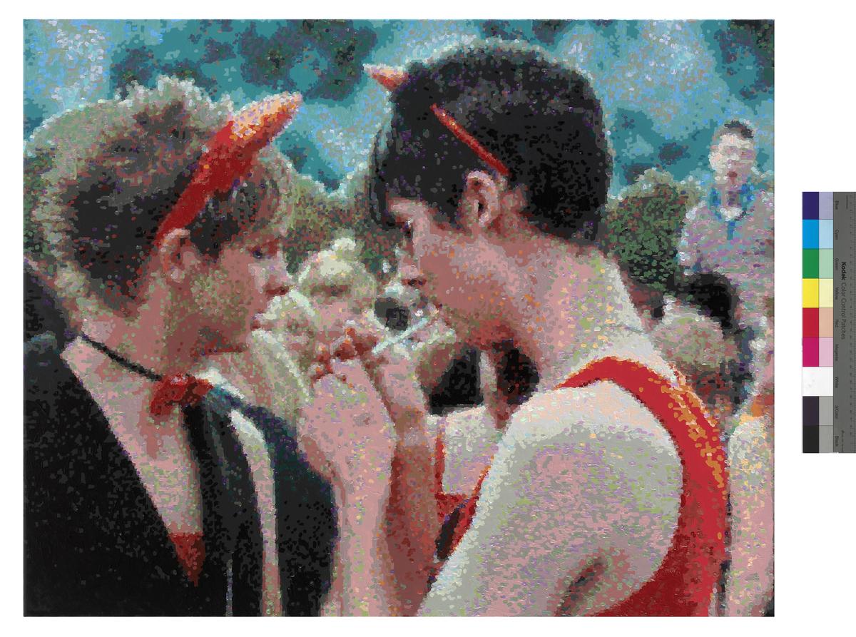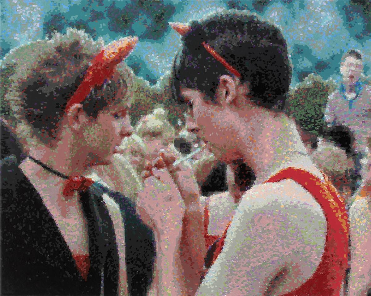 Die Gemälde von Römer + Römer zeigen Menschen fast nie isoliert. Figuren verschränken sich zu dichten Bildfeldern, Farben flirren, Konturen lösen sich auf. Der einzelne Körper wird Teil eines größeren Gefüges. Trotz der Fülle bleibt der Blick präzise; jedes Bild ist sorgfältig komponiert und entzieht sich eindeutiger Wertung. Dokumentation und Interpretation, Nähe und Distanz stehen in einem spannungsreichen Gleichgewicht.