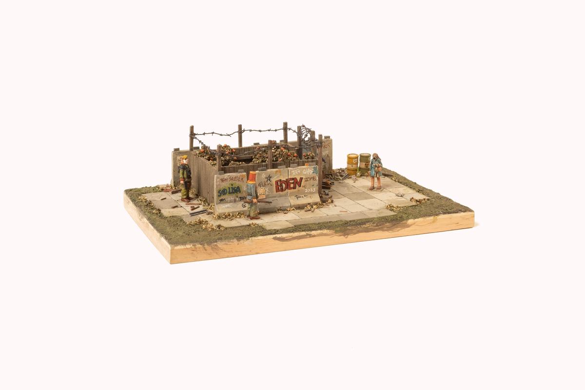 Peter Sauerer schnitzt im extrem kleinen Format Szenen der Weltgeschichte. Seine farbig gefassten Objekte wirken auf den ersten Blick verspielt, entfalten jedoch eine satirische Schärfe, die weit über das Miniaturhafte hinausweist. In winzigen Dioramen treten Figuren aus Welt-, Kunst- und Filmgeschichte auf, nicht selten in postapokalyptischen Konstellationen. Bedeutende Bauwerke erscheinen als auf den Kopf gehängte Schnurarchitekturen – fragile Konstruktionen zwischen Ikone und Irritation. Und in seinen „Blackboxes“ wird das Publikum selbst zum Voyeur: Wer hineinschaut, wird Teil eines ebenso subtilen wie gesellschaftskritischen Spiels.