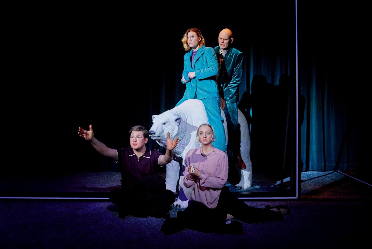 v. links/ vor dem Eisbär: Geronimo Hartwig, Laura Storz (als Kinder der Familie); auf dem Eisbär sitzend: Linda Rohrer, Toomas Täth (als Eltern der Familie), Foto © Nik Schölzel