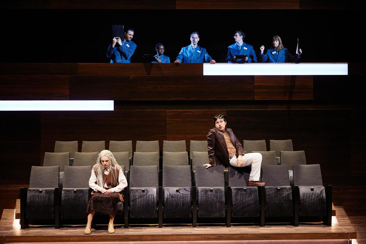 Dann wurden einige mit Reihen- und Sitzplatznummer auf die Bühne, die mit drei Sitzreihen den Publikumsraum spiegelte (Bühne Jan Hendrik Neidert, Kostüme Lorena Diaz Stephens), gerufen: Die 91-jährige Beatrice Killick (Adeline Schebesch), lange graue Haare, tiefe Augenränder, die nicht loslassen kann, sich unentwegt um ihre zurückgebliebene Katze sorgt, die sehr jung verstorbene Jill Smith (Marie Dziomber) mit rosa Plüschdelfin im Arm, die direkt aus einem Disney-Rummelplatz gefallen zu sein schien, Hiro Mochizuki (Pius Maria Cüppers), ein stiller alter Mann im Trenchcoat, Graham Jenkins (Joshua Kliefert), der noch immer den Klang eines Glöckchens im Ohr hatte, sowie Obafemi Taylor (David Gaviria), der sich überaus aktiv jeglicher Entscheidung für eine Erinnerung verweigerte. Gelandet waren die fünf in einer Art Zwischenraum, nicht mehr im Leben und doch noch nicht in der Ewigkeit. Es ging nicht um Gut oder Böse, Himmel oder Hölle, sondern darum, von welchem Glücksgefühl sie in der Ewigkeit umfangen sein wollten.